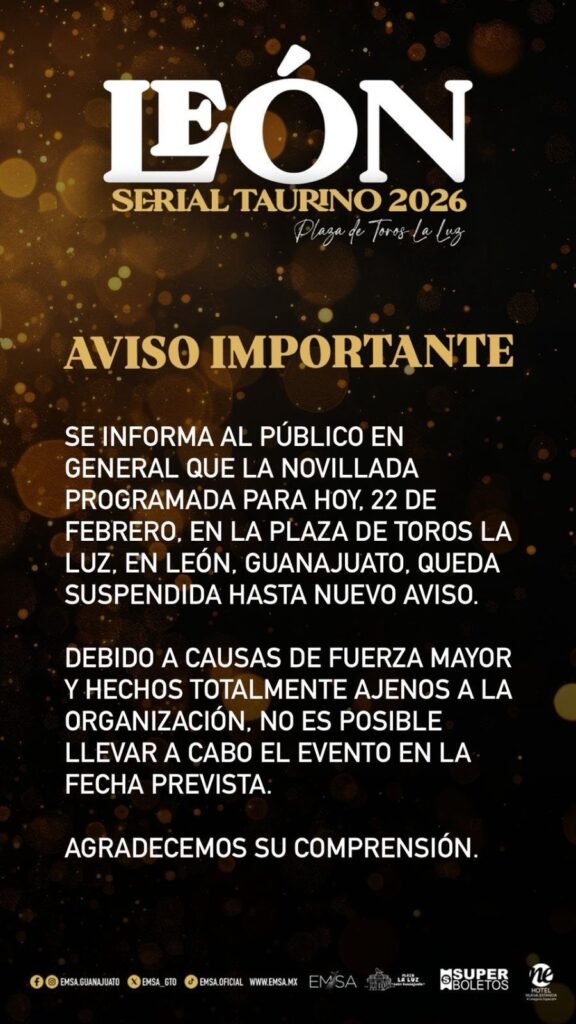 La empresa Espectáculos Monterrey que la novillada anunciada para este domingo en la plaza «La Luz» de León, Guanajuato fue suspendida hasta nuevo aviso, por los hechos sociales ocurridos esta mañana.